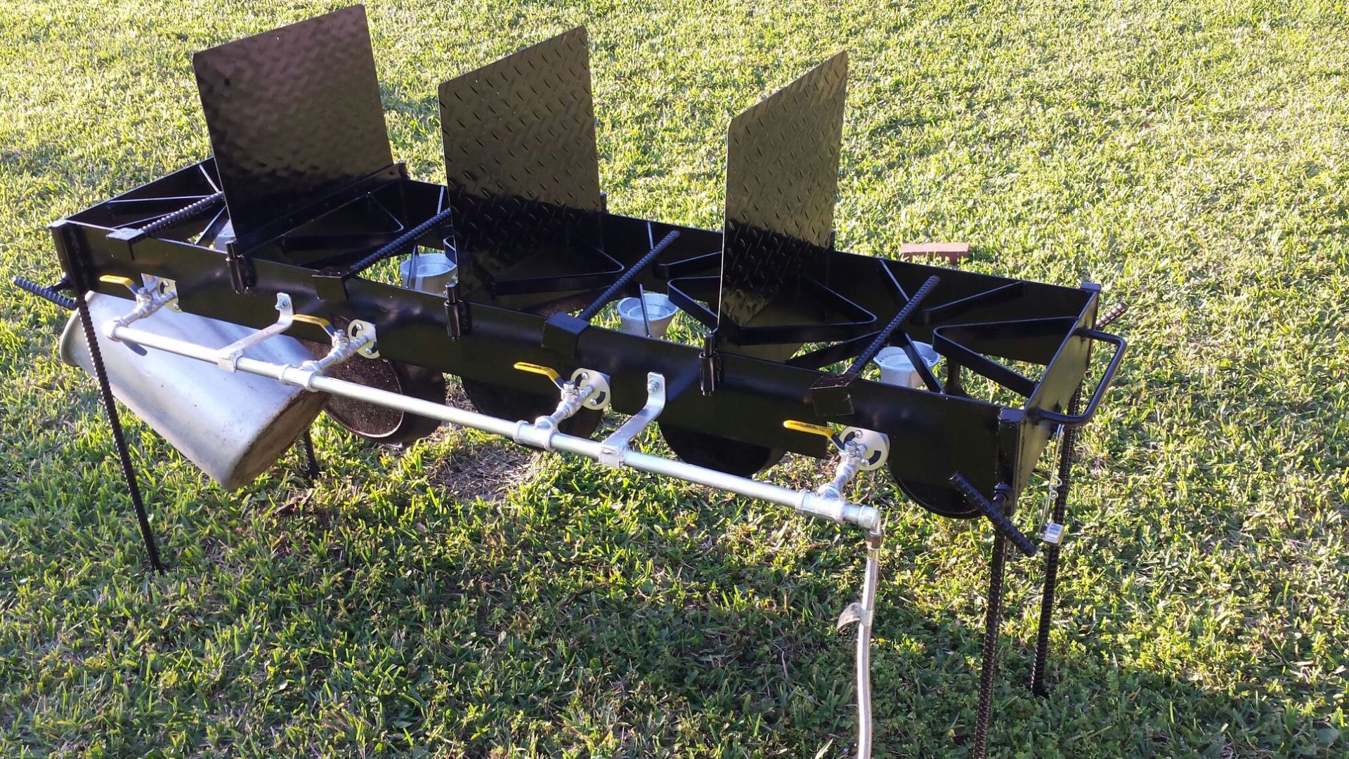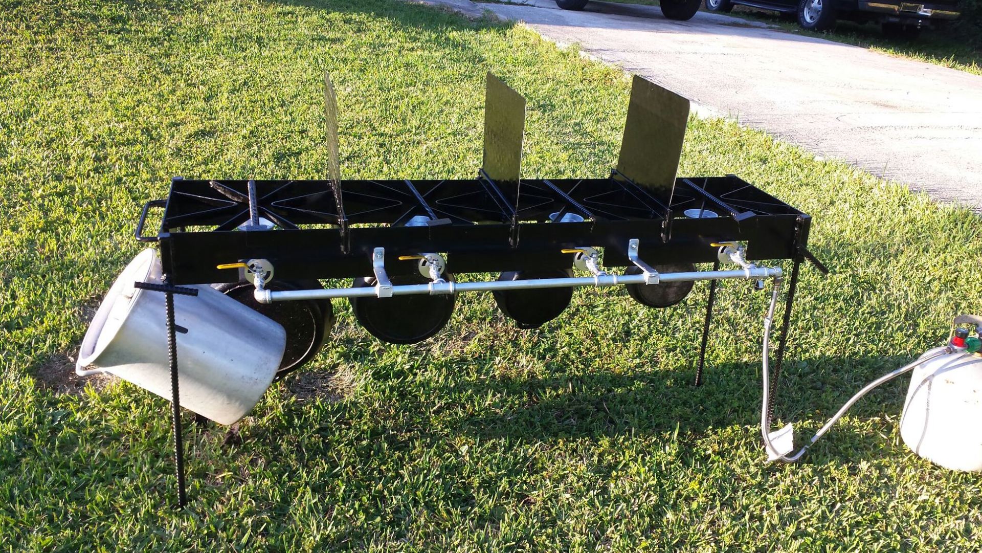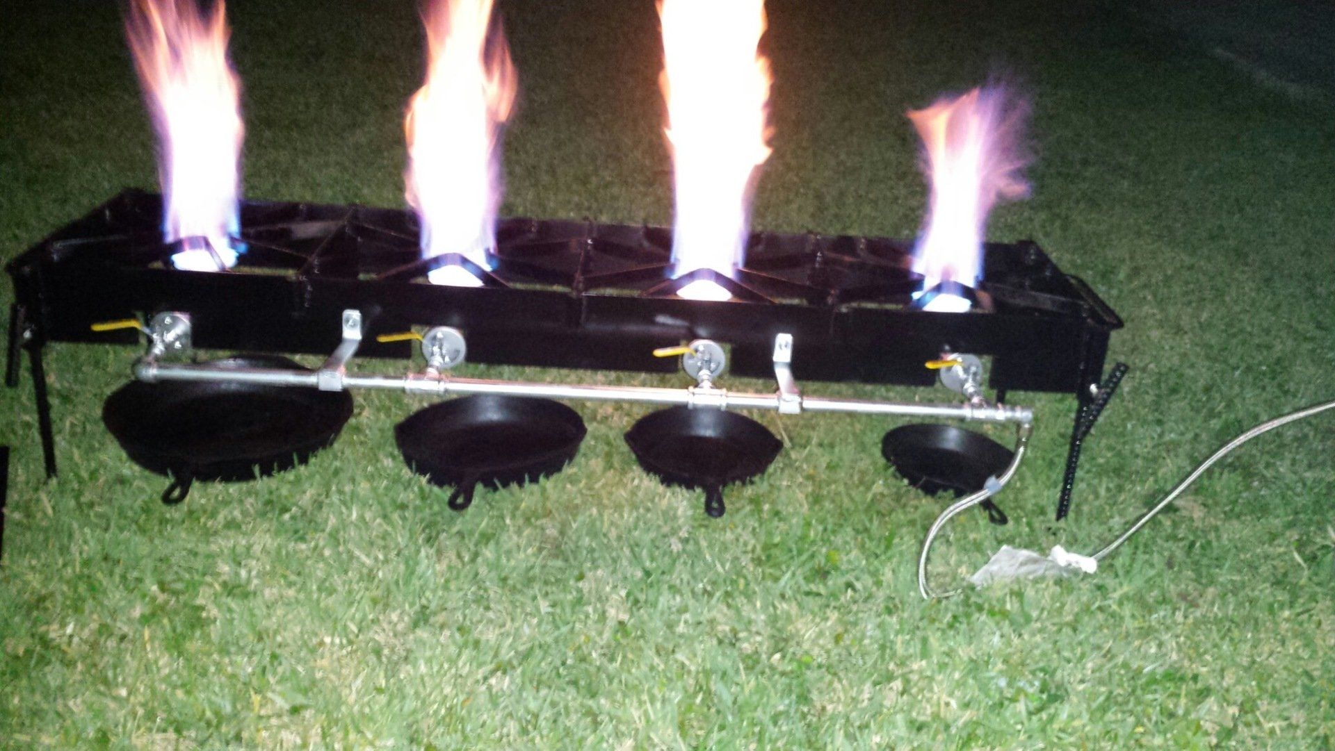 Cook Real Fish or other food on this multi-burner, free standing cooker. Made from 3/16" thick steel with a hand made 1/2" thick Galvanized manifold. 4 Brass Ball control valves with positive on and off. 4 Splatter/Grease shields to prevent grease cross-contamination when frying different foods. 6 Utensil hooks for hanging pots, pans and utensils. 2 sets of legs (4 each) one set is 30" high and the other set is 15" high. This allows the unit to be lowered to fry turkeys or other large quantity of cooking. Legs have 'feet' at bottom to prevent sinking.