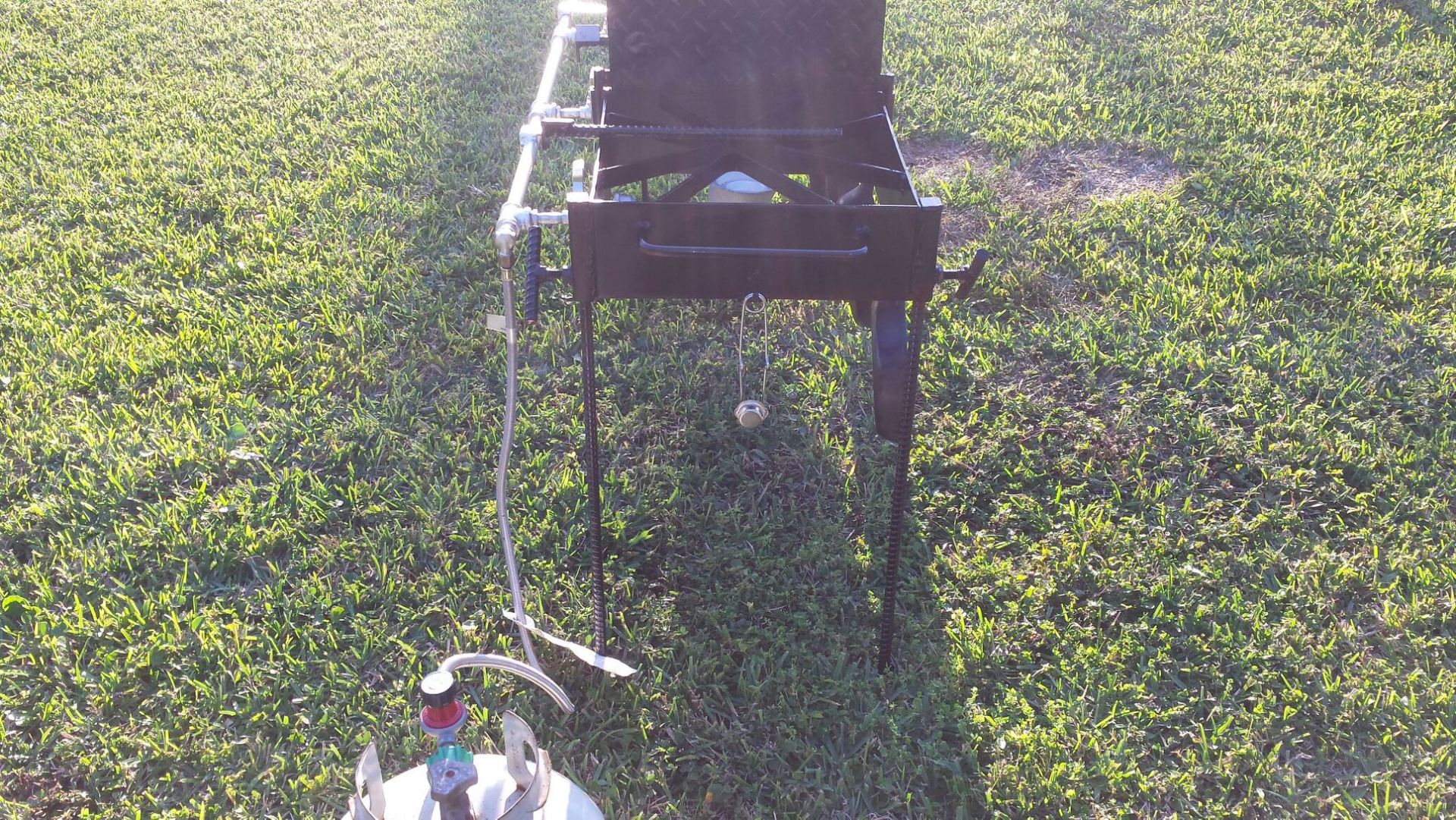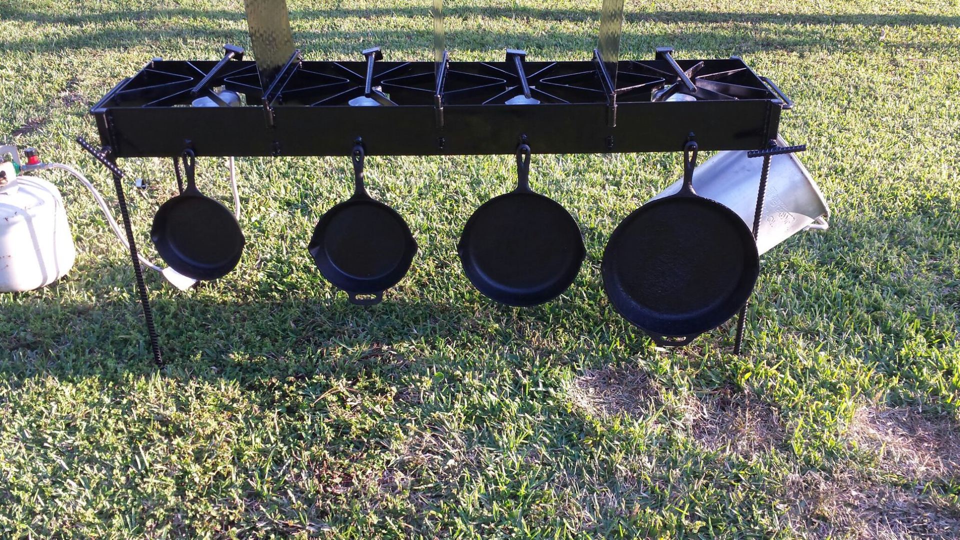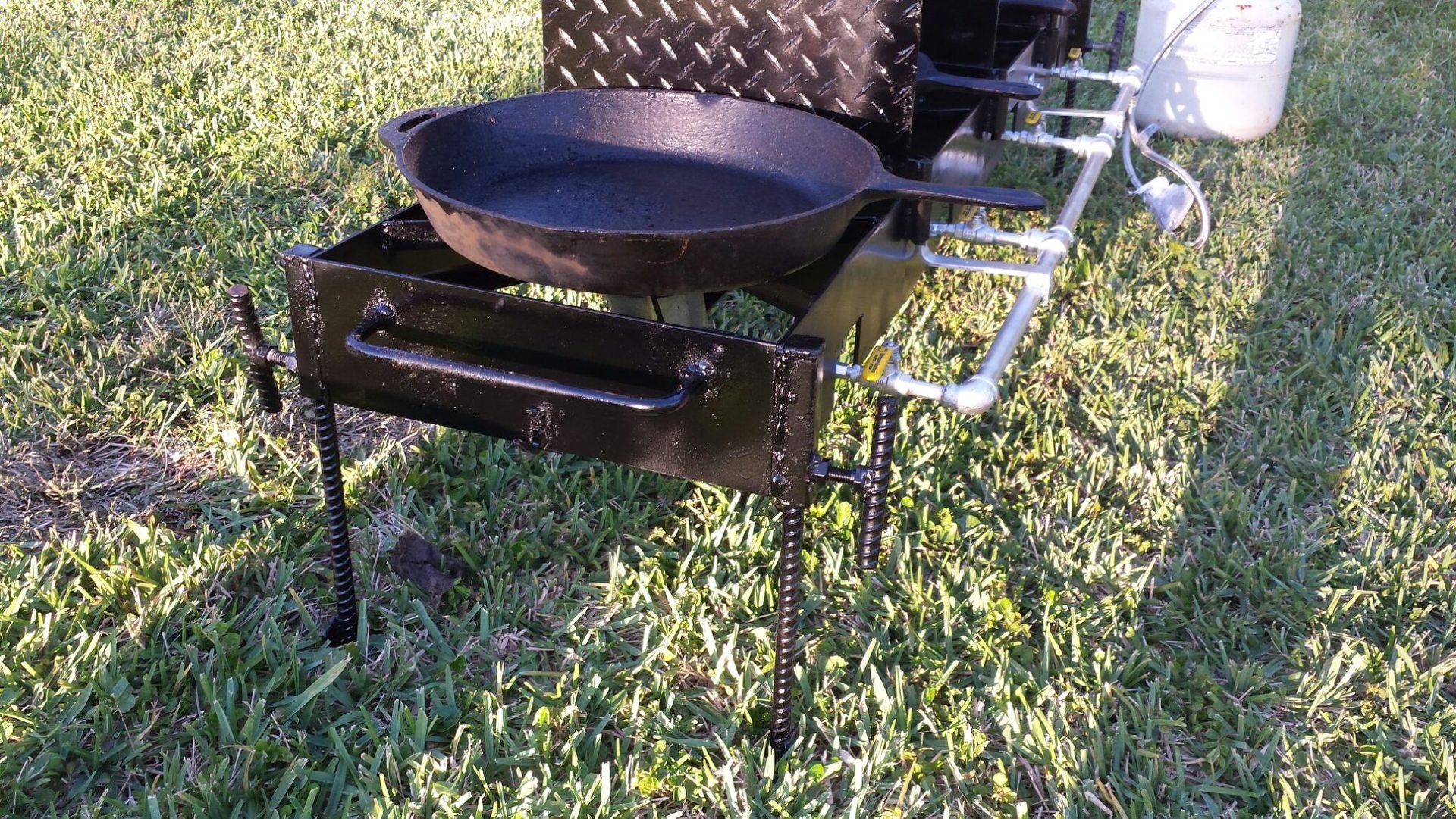Cook Real Fish or other food on this multi-burner, free standing cooker. Made from 3/16" thick steel with a hand made 1/2" thick Galvanized manifold. 4 Brass Ball control valves with positive on and off. 4 Splatter/Grease shields to prevent grease cross-contamination when frying different foods. 6 Utensil hooks for hanging pots, pans and utensils. 2 sets of legs (4 each) one set is 30" high and the other set is 15" high. This allows the unit to be lowered to fry turkeys or other large quantity of cooking. Legs have 'feet' at bottom to prevent sinking.