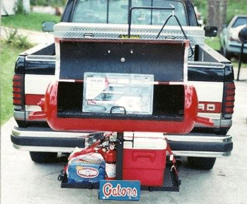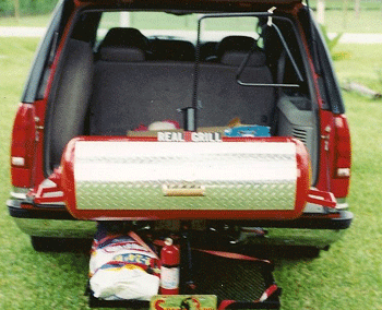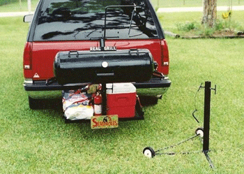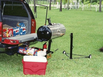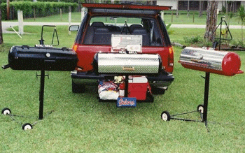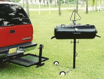 The RG-12 is the perfect grill for the serious tailgater. It features 300 sq. ft. of cooking area. It cooks via direct heat and uses either wood or charcoal as a fuel source. It has its own travel platform that mounts on the trailer platform of most SUV's and pickup trucks. The platform also converts to a table. It's a temendous value for the price.